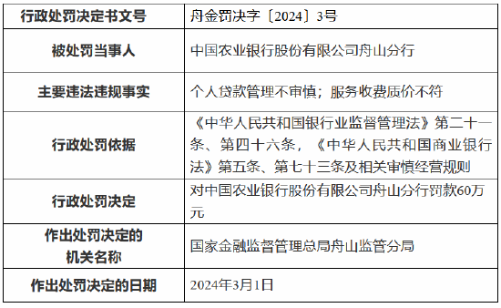 因个人贷款管理不审慎 农业银行舟山分行被罚60万元