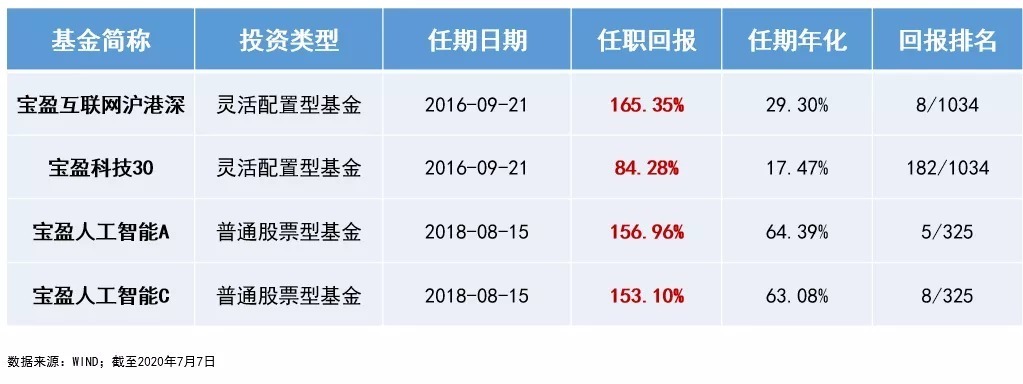 在他任期内,他管理的这三只基金,截至2020年7月7日,任期回报分别为165.35%、84.28%、156.96%。