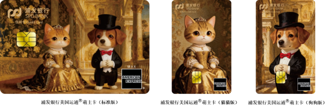 浦发运通®萌主卡在卡面设计中将萌宠形象拟人化,共计标准版、猫猫版、狗狗版三个版面,采用布纹工艺,结合光影层次形成油画质感,精致复古,展现审美格调。