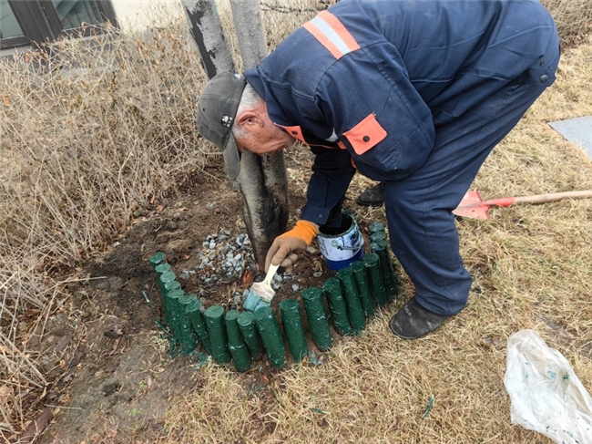 作业前,项目工作人员对园区内所有树池设施进行了细致摸排,逐一清理杂物、松土,并对老化、松动的木桩进行加固或更换。施工过程中,团队严格执行防腐处理工序,随后统一涂刷高性能户外漆。部分区域更创新采用彩色涂装工艺,使得原本单调的木质围挡焕然一新,呈现出既实用又富有趣味的景观效果。