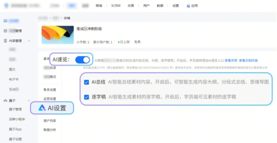 AI 速览功能聚焦内容梳理与信息提炼需求,可对单素材或系列素材进行结构化梳理,自动生成内容总结、思维导图等多维度信息输出,帮助商家快速完成素材的系统化整理。商家可在小鹅通商家管理台内容管理模块直接开启该功能,针对专业术语等内容进行手动修正,确保输出内容的专业性与准确性。该功能可适配多类型培训素材,帮助用户快速抓取长篇资料核心要点,提升信息吸收效率,同时减轻商家内容二次加工的工作负担,优化内容传递的全流程体验。